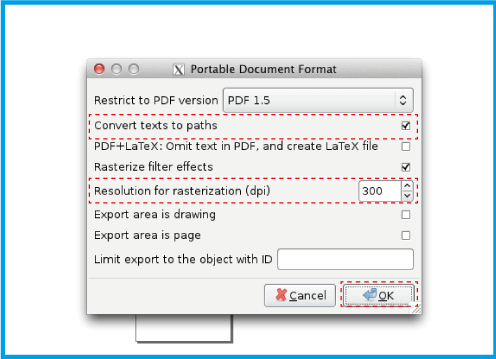 3.2 .In the new window that opens, select the Convert text to path option so your document does not change. In Resolution for rasterization (dpi) enter 300. Click Ok .